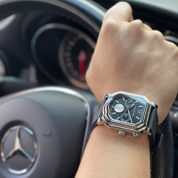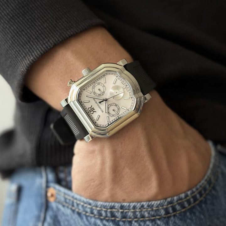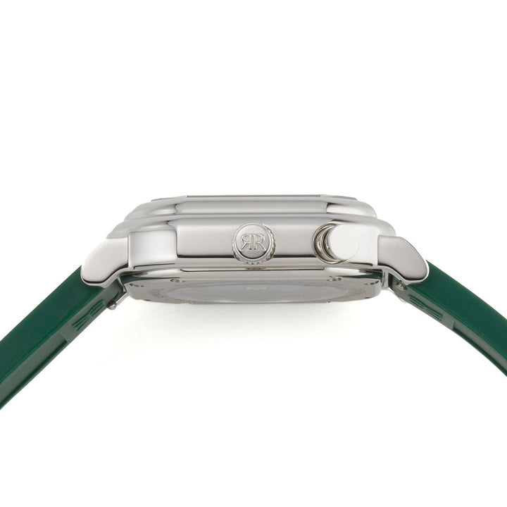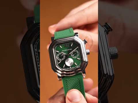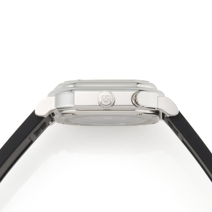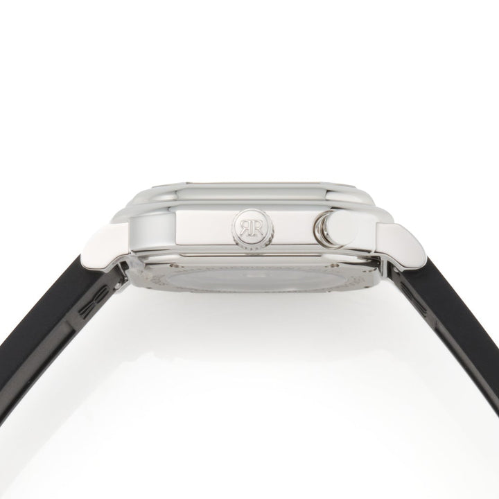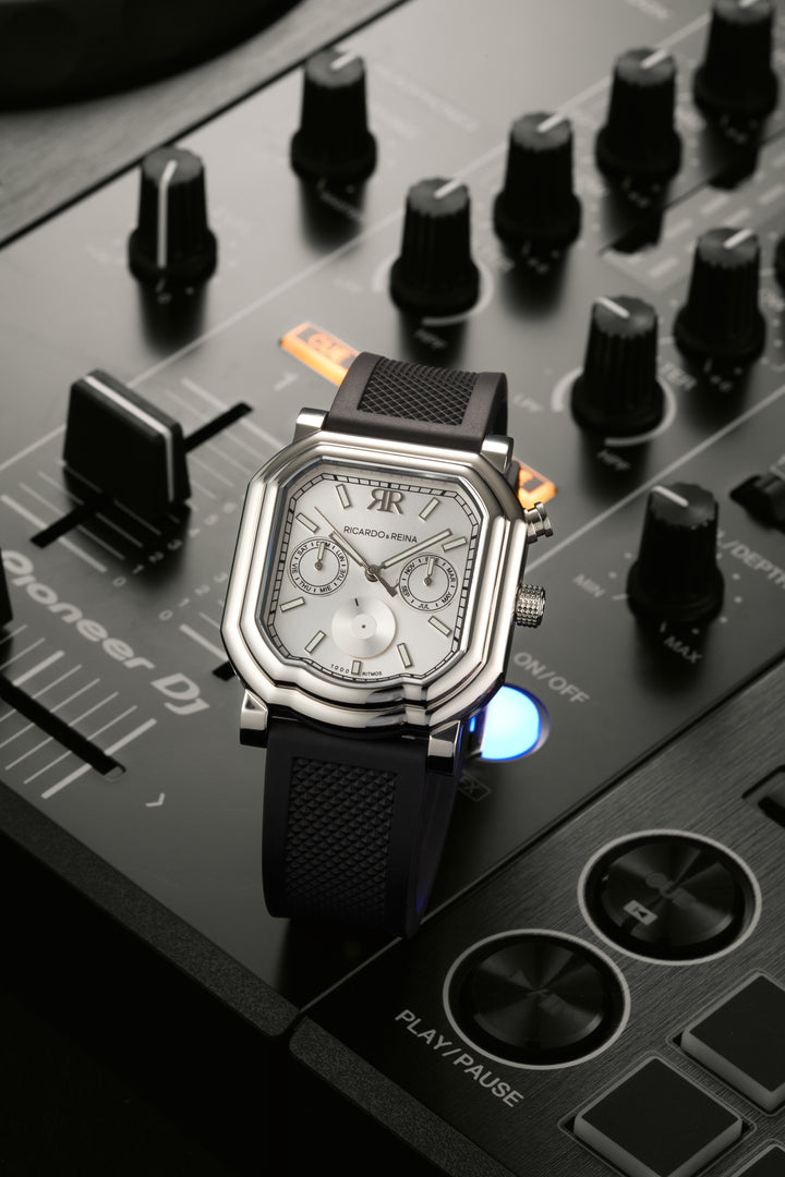 Los índices horarios, inspirados en las teclas de un piano y enmarcados en latón plateado, refuerzan el motivo musical con una elegancia sutil. El diseño de la caja “Maestro” toma inspiración del trabajo visionario de Gérald Genta, el célebre diseñador suizo creador de íconos como el Patek Philippe Nautilus y el Audemars Piguet Royal Oak y fue el último diseño (y una de sus colecciones menos conocidas) que creó antes de fallecer en 2011. El nombre de la caja y su arquitectura asimétrica amplifican el simbolismo artístico y musical de un Maestro, armonizando de manera perfecta con el ritmo creativo de la colección 1000 Ritmos.